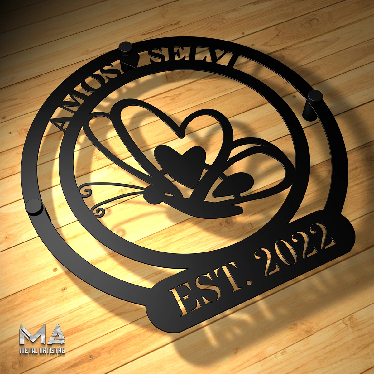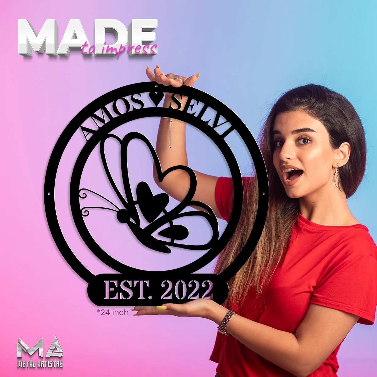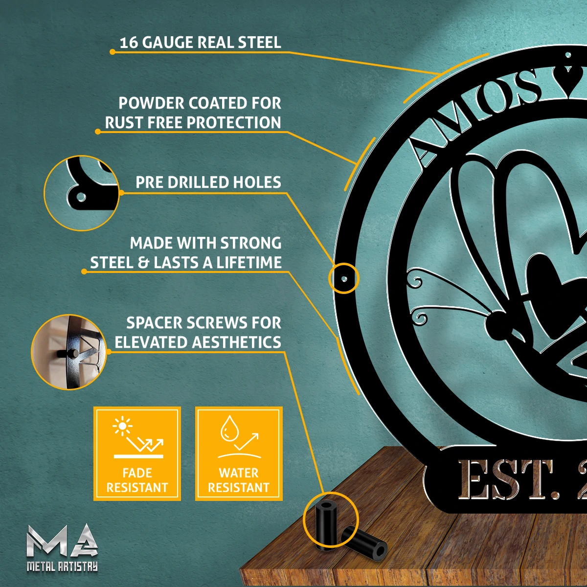 Discover Butterfly Bliss Personalized Metal Sign by Metal Artistry, a beautifully crafted piece that symbolizes eternal love. This unique design features a graceful butterfly at the center, surrounded by the names of a cherished couple and their wedding year. Printed on high-quality metal, this Butterfly Bliss sign adds a touch of romance and personalization to any space.