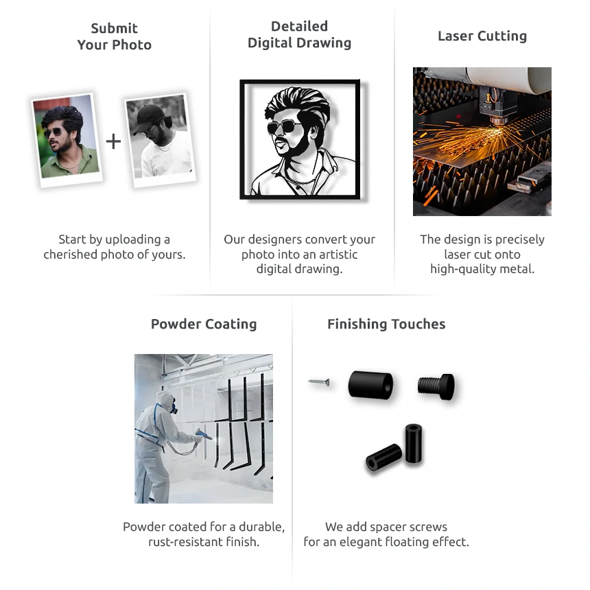 Starting with precise laser cutting for immaculate outlines, our metal artworks are then brought to life through meticulous handwork.