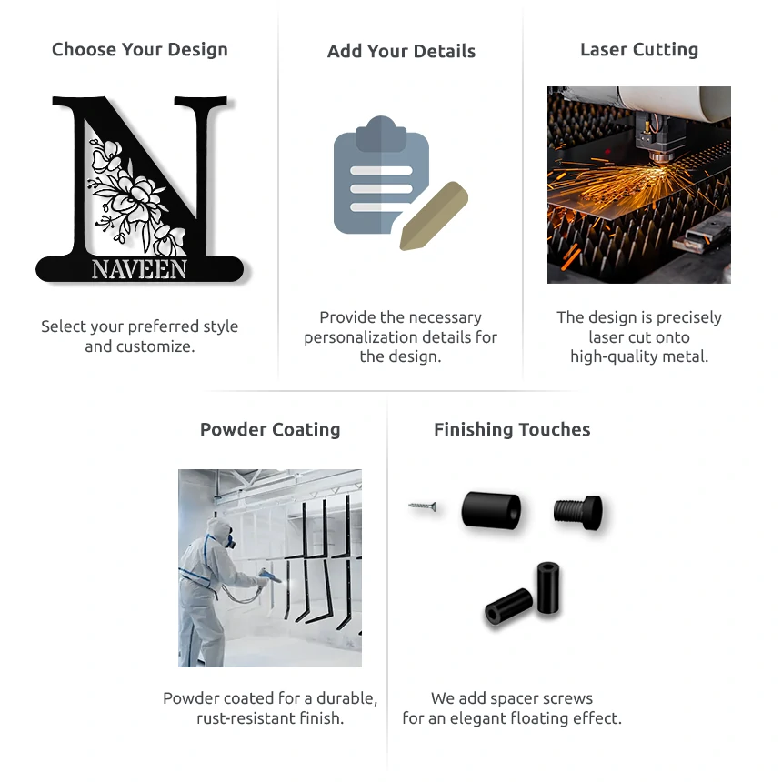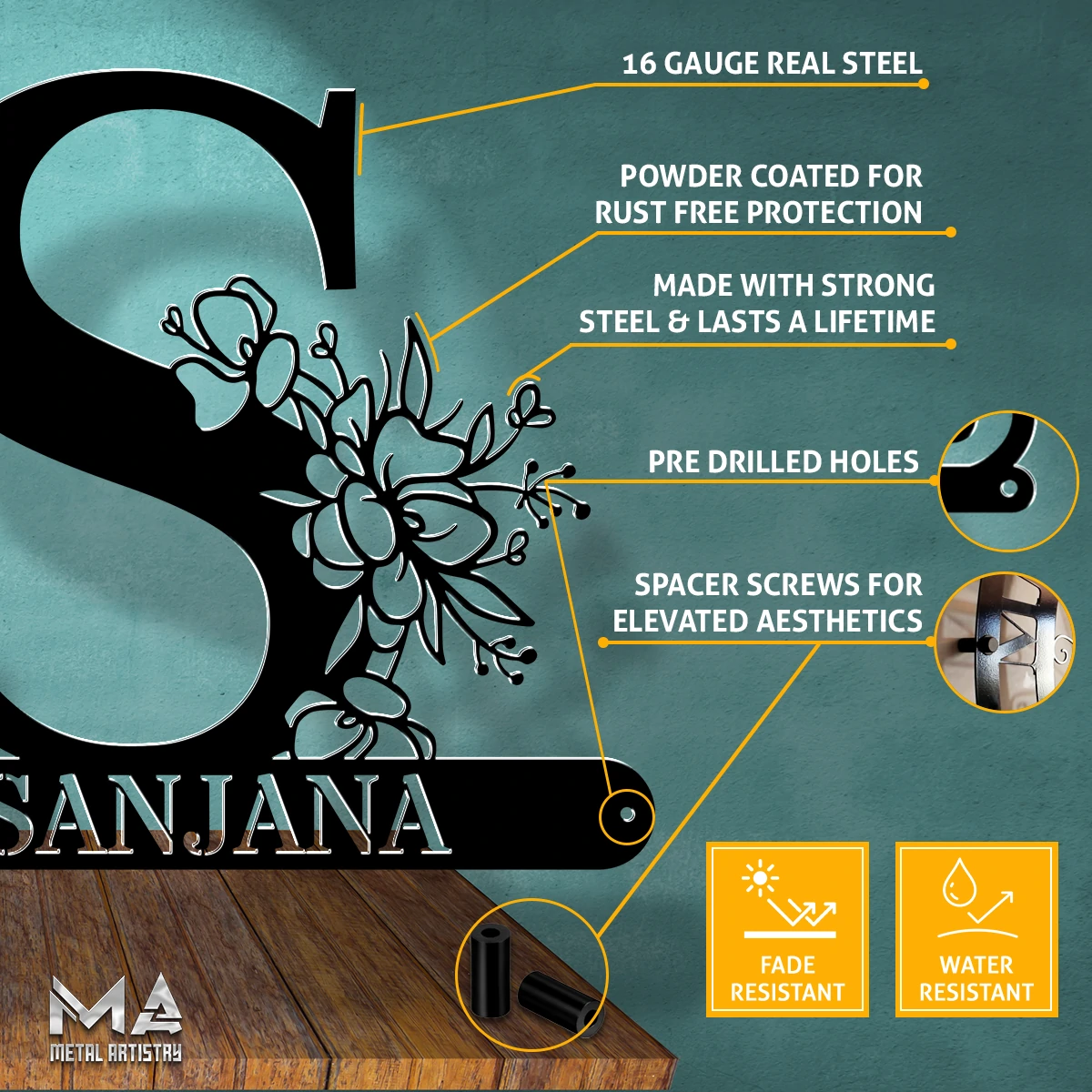 Introducing Floral Initial Bloom Personalized Metal Sign by Metal Artistry, a charming and personalized design featuring a single name with a large alphabet adorned with blooming flowers. Crafted with intricate floral details on durable metal, this sign adds a touch of natural beauty and elegance to any space. Celebrate your unique identity with the enchanting Floral Initial Bloom from Metal Artistry.